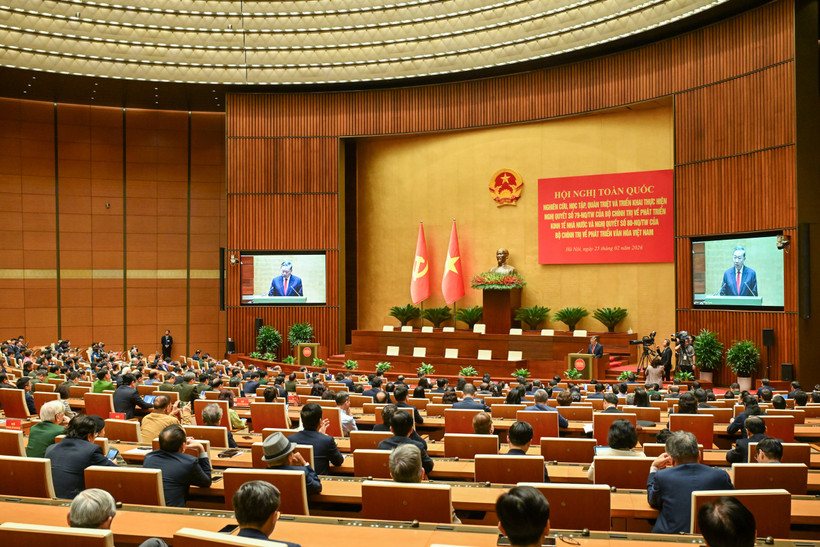 Ngày 25/2, tại Hội trường Diên Hồng - Nhà Quốc hội, Bộ Chính trị, Ban Bí thư Trung ương Đảng tổ chức Hội nghị toàn quốc nghiên cứu, học tập, quán triệt và triển khai thực hiện Nghị quyết số 79-NQ/TW của Bộ Chính trị về phát triển kinh tế nhà nước và Nghị quyết số 80-NQ/TW của Bộ Chính trị về phát triển văn hóa Việt Nam. Đồng chí Tổng Bí thư Tô Lâm dự và phát biểu chỉ đạo tại điểm cầu Trung ương.